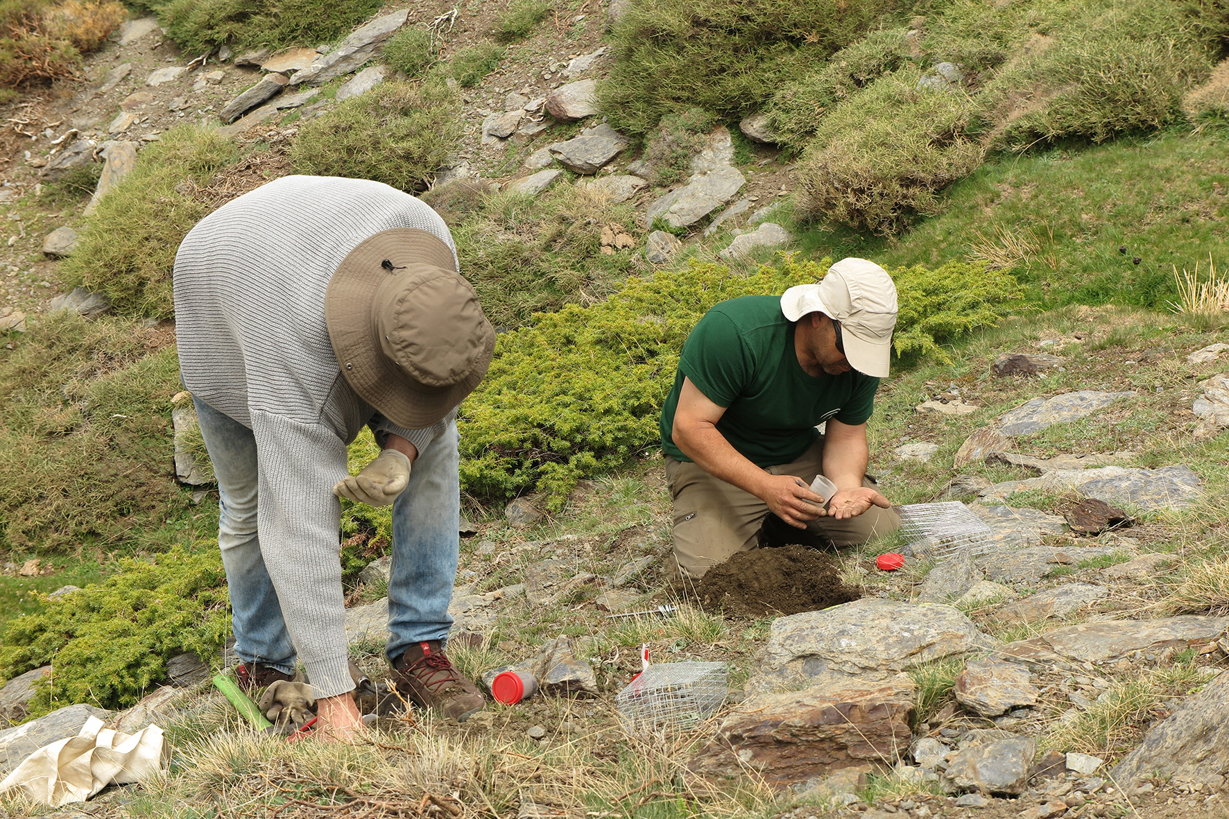 José Miguel Muñoz y Miguel Arrufat (Agencia de Medio Ambiente y Agua) siembran con meticulosidad las semillas que permitirán definir estrategias de restauración de los matorrales de montaña de Sierra Nevada.